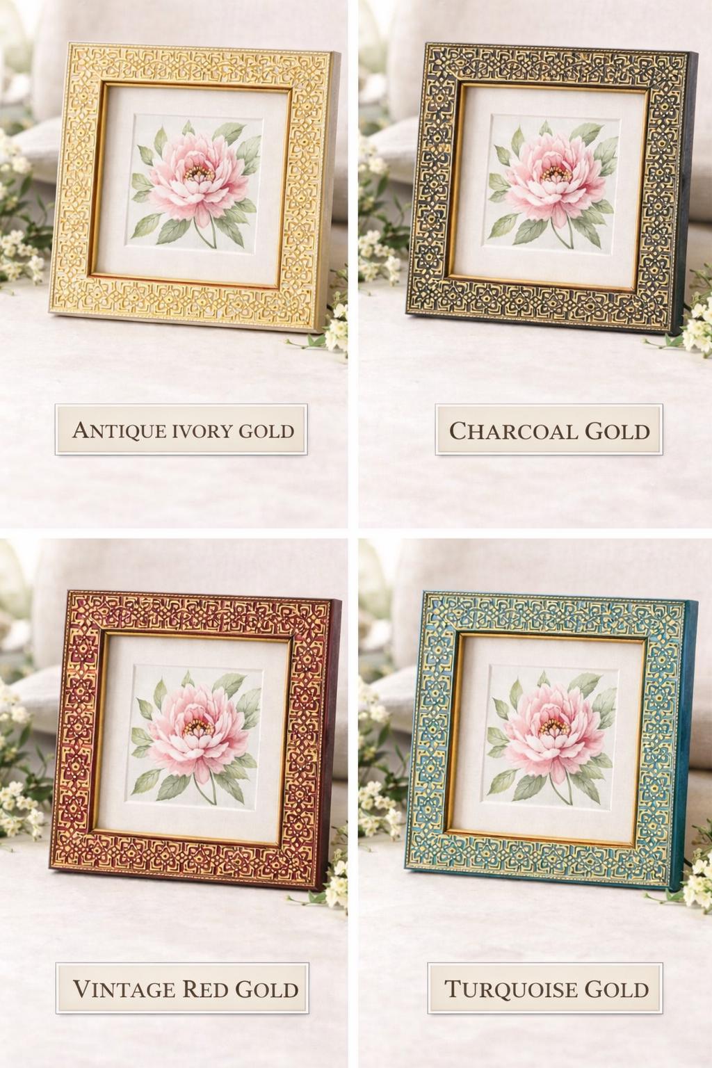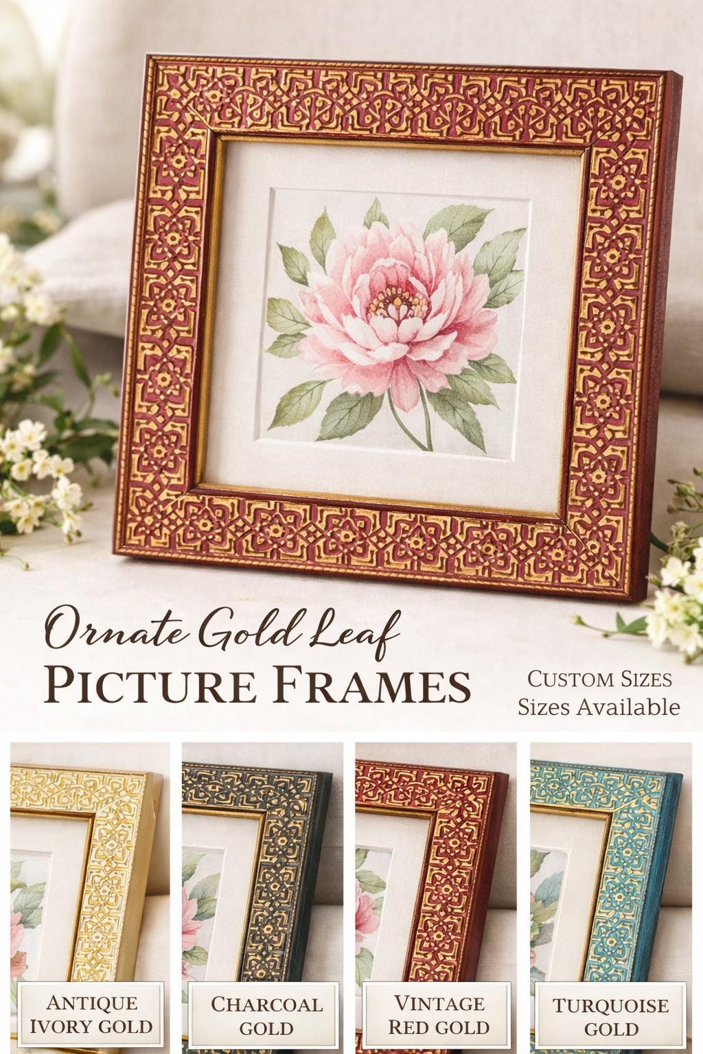 Each frame features a beautifully detailed pattern with gold leaf accents that catch the light and elevate any artwork, photograph, or canvas.